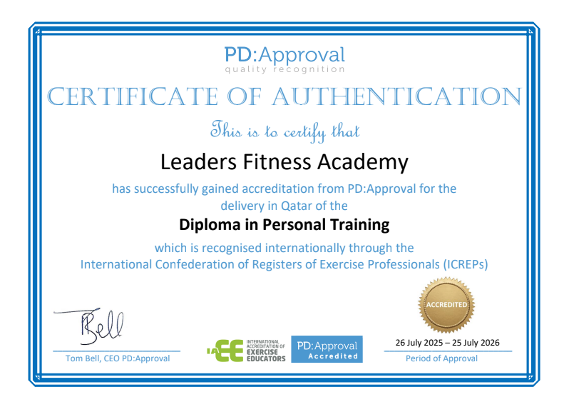 This is a foundation program that allows the students to have an in-depth understanding of the science behind the various concepts and components of health and fitness. The course is comprised of well-researched and up-to-date information that holds the key to unlocking a student’s potential of utilizing all the given tools in the most effective way for their clients to succeed in both physical and behavioral aspects. Our Diploma is Internationally recognized by AIEE and accredited by PD:Approval UK which will allow the learner to work as a world-class Personal Trainer.