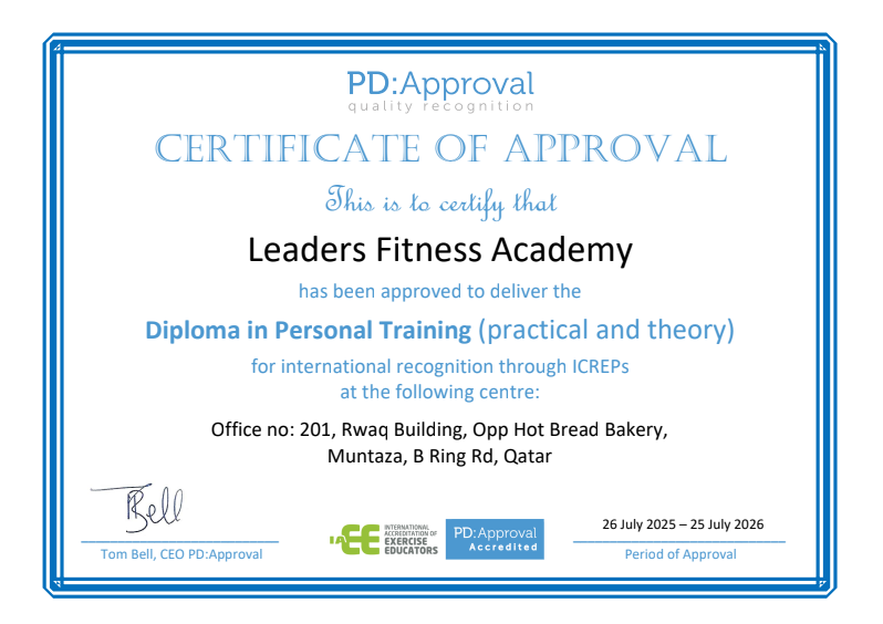 Leaders Fitness Academy is the one and only academy offering Diploma in Personal Training Certification which is internationally recognized by IAEE and accredited by PD:Approval UK. The Group offers an exclusive opportunity for all who are passionate to have a career in Health and Fitness, achieve their goals and become International Personal Trainer. Leaders Fitness Academy takes pride in having a state-of-the-art gym equipped with a training facility for both practical and theory classes for our students. Our courses are designed not only to provide students with up-to-date theoretical knowledge in the health and fitness industry but also to give them a chance to practically apply all the tools and information that they have gathered from the theory sessions.